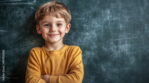 Portrait of a Happy Young Boy in Front of a Blackboard