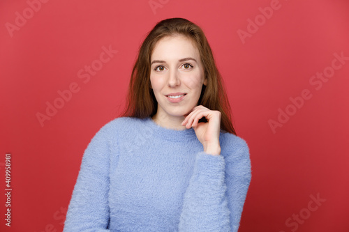 Portrait of a happy young girl with a snow-white smile on a pink background