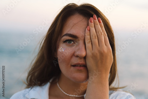 Portrait of a happy young woman on a background of beautiful sea. The girl looks at the magical sea. Freedom and happiness