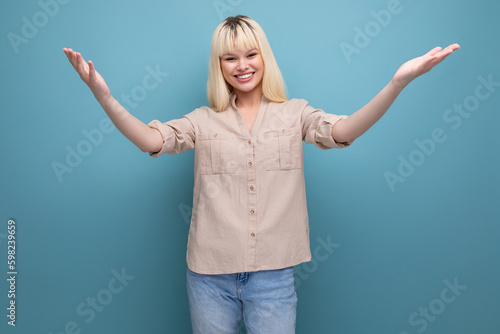 portrait of a hospitable cheerful european blonde young lady on the background with copyspace