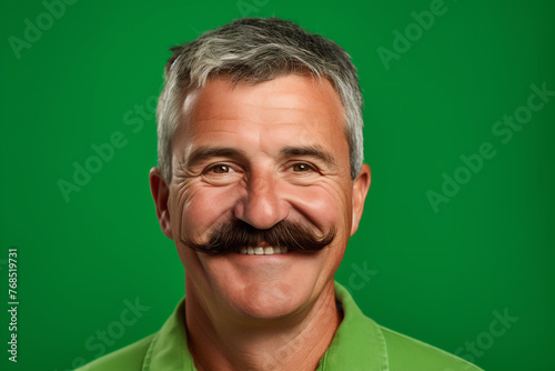 Portrait of a Joyful Elderly Man with a Gray Mustache Smiling Against a Vibrant Green Background, Positive Aging and Happiness Concept