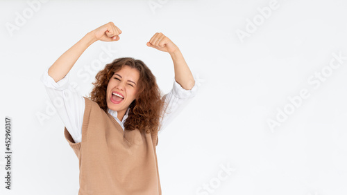 Portrait of a joyful happy teenage girl celebrating success while dancing isolated over white background