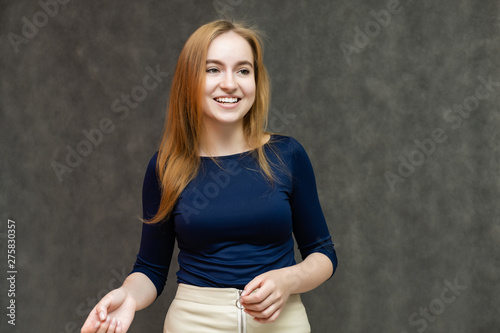 Portrait of a knee-high beautiful pretty red-haired woman girl in a blue jacket with a light skirt on a gray background in the studio. Smiles, shows emotions, talks, spreads his hands.