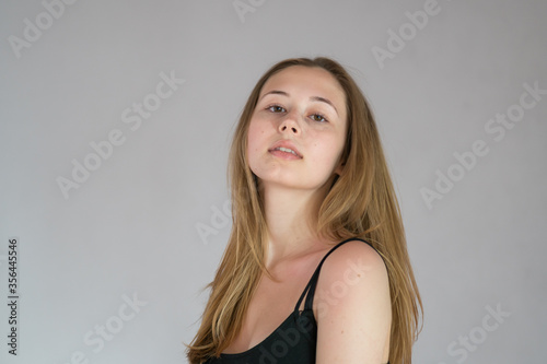 Portrait of a languishing and charming young woman with long hair posing looking at the camera on a grey background