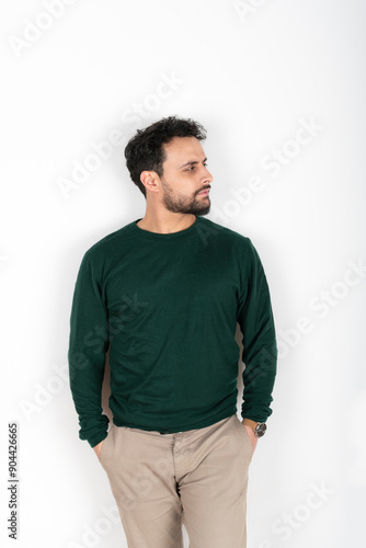 Portrait of a latin man looking to the side. White background