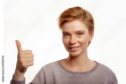 Portrait of a laughing woman showing thumbs up isolated on a white background