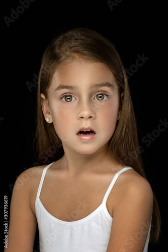 portrait of a little beautiful girl in a white T-shirt on a black background. Emotions