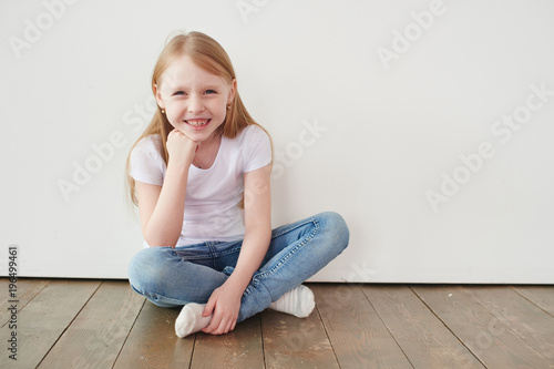 Portrait of a little girl sitting on a wooden floor near a white wall