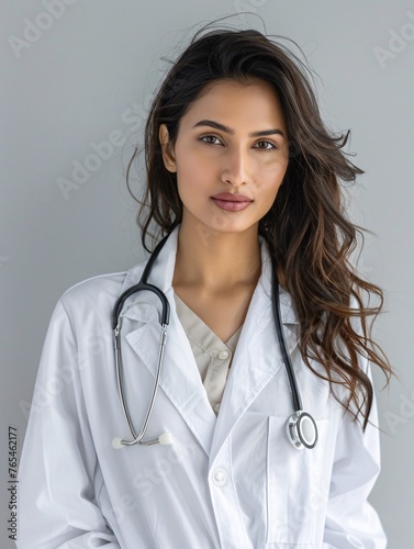 Portrait of a lovely Indian female physician wearing a white lab coat and stethoscope, posed in front of a grey studio backdrop with a pleasant expression.