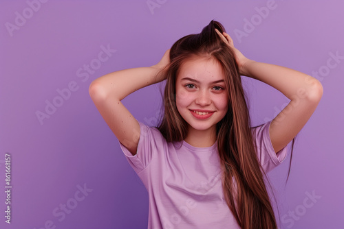Portrait of a lovely young girl touching her hair, wearing a shirt, isolated on a purple background. Perfect for fashion and beauty themes