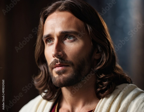 Portrait of a Man Dressed as Jesus. White robe. Long brown hair and beard. Man appears to be in his early 30s, and he has a serious expression on his face. Christian religion and faith. AI generated