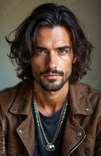 Portrait of a man with long hair in leather jacket. Stylish male model with intense gaze. Handsome guy poses for photo session. Fashion, lifestyle, art concept.