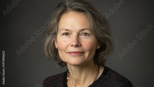 Portrait Of A Mature Woman With Gray Hair Against Gray Background