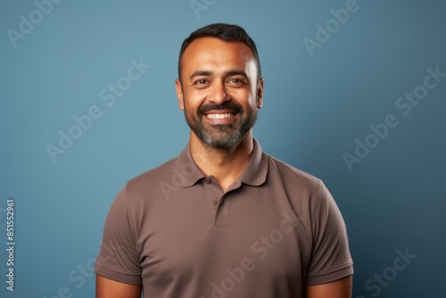Portrait of a merry indian man in his 40s wearing a sporty polo shirt while standing against light wood minimalistic setup