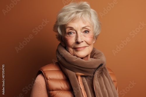 Portrait of a merry woman in her 70s dressed in a thermal insulation vest while standing against soft brown background