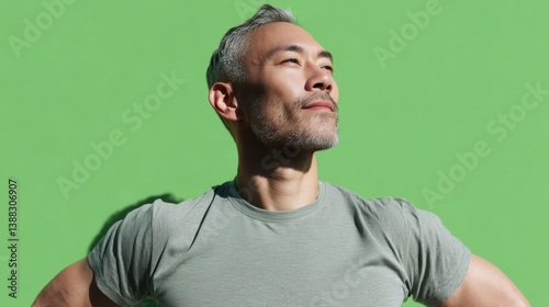 Portrait of a middle-aged asian man with short grey hair and a beard. he is wearing a light green t-shirt and is standing against a green background.