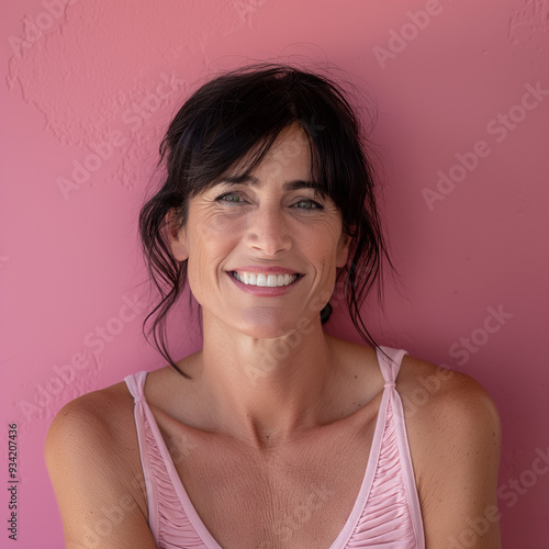 Portrait of a middle-aged woman with wavy brown hair, smiling warmly against a soft pink background