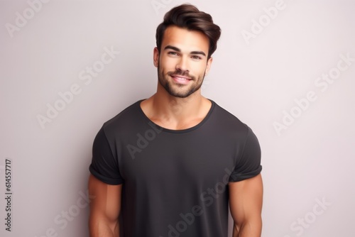 Portrait of a muscular handsome guy wearing a plain t-shirt, isolated on a pastel background. Generative AI illustration.