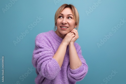 portrait of a pleasant charming pleasant blond young woman in a purple sweater smiling on a blue background with copy space