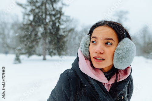 Portrait of a positive Hispanic woman walking in a frosty park on a snowy winter day and looking away with a cheerful face.