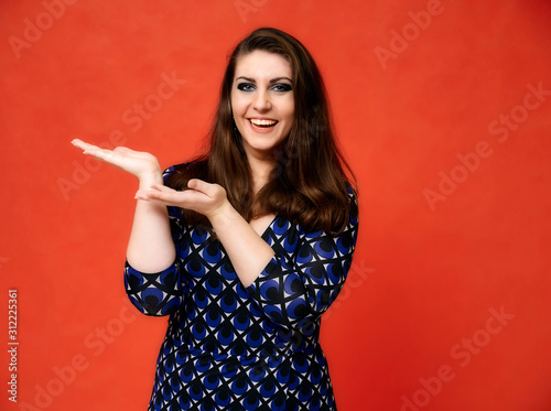Portrait of a pretty brunette woman with a beautiful hairstyle and with excellent makeup in a dark blue blouse on a red background. He stands with a smile and shows his hands with emotions.