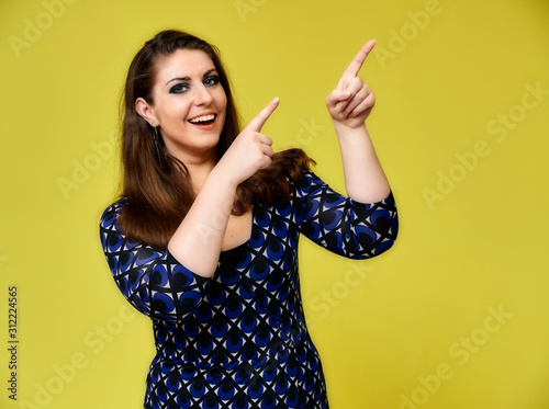 Portrait of a pretty brunette woman with a beautiful hairstyle and with excellent makeup in a dark blue blouse on a yellow background. It stands showing hands with a smile in front of the camera.