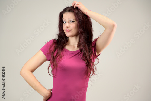 Portrait of a pretty slim brunette woman with emotions in a pink dress and with brown hair on a white background in the studio. The model is smiling and talking nicely.