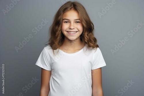 Portrait of a pretty smiling 7-year-old girl in a white T-shirt on a gray background, copy space. Happy child, childhood