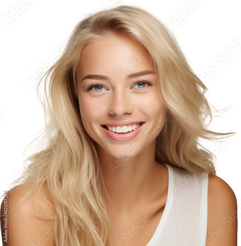 Portrait of a pretty smiling young blond woman isolated on white background as transparent PNG