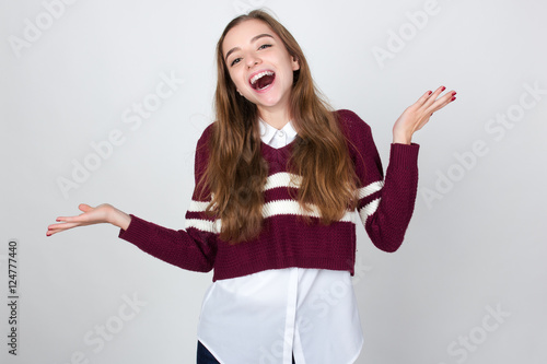 Portrait of a pretty woman  in short sweater, white shirt  smiles and spreads his arms to the sides standing over gray background and looking at camera