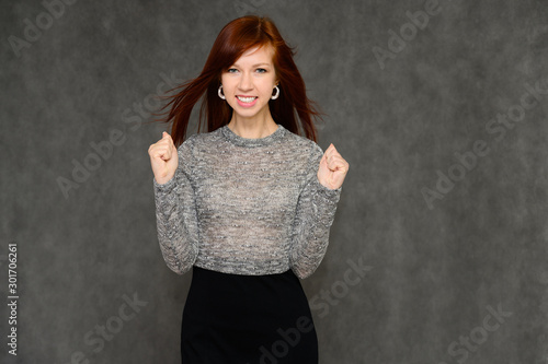 Portrait of a pretty woman, red-haired girl with long smooth hair on a gray background in a gray dress. Talking to the camera, showing joy and surprise, smiling.