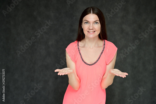 Portrait of a pretty young brunette woman with combed hair on a gray background in a pink blouse. It is in different poses. Looks straight at the camera. Slim figure.