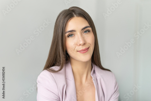 Portrait of a responsive and sociable middle-aged business woman in a jacket with dark hair. Against the backdrop of a minimalist interior.