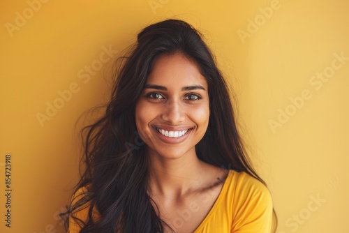 Portrait of a satisfied indian woman in her 20s smiling at the camera in soft yellow background