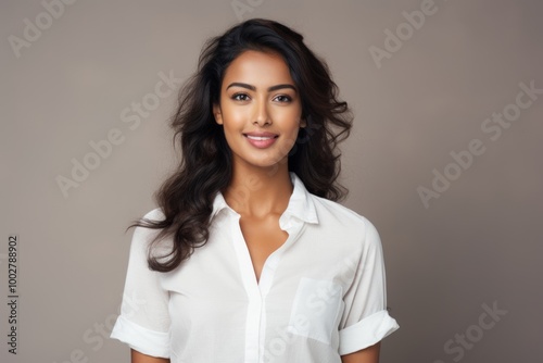 Portrait of a satisfied indian woman in her 20s wearing a simple cotton shirt isolated on blank studio backdrop