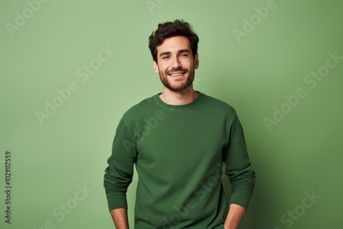 Portrait of a satisfied man in his 20s showing off a thermal merino wool top in soft green background