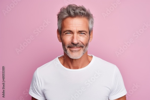 Portrait of a satisfied man in his 50s donning a trendy cropped top against a pastel or soft colors background. AI Generation