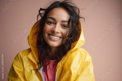Portrait of a satisfied woman in her 20s wearing a vibrant raincoat against a pastel gray background. AI Generation