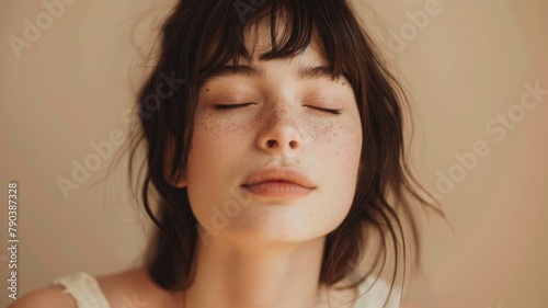 Portrait of a serene young woman with eyes closed - Intimate close-up of a serene young woman with freckles, eyes closed, and a peaceful expression