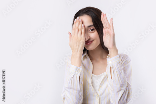 Portrait of a serious young woman showing stop gesture with her palm over white background