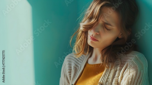 Portrait of a sick woman with stomach ache, pain sickness in studio background.