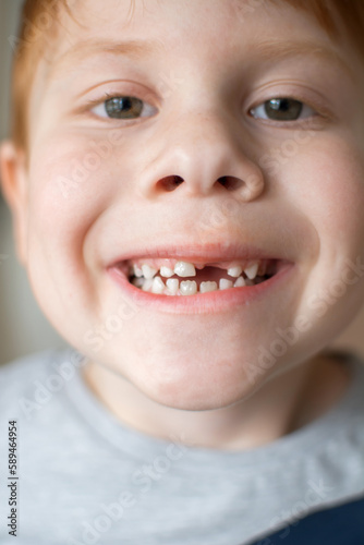 Portrait of a six-year-old boy without one front tooth. Baby tooth falling out