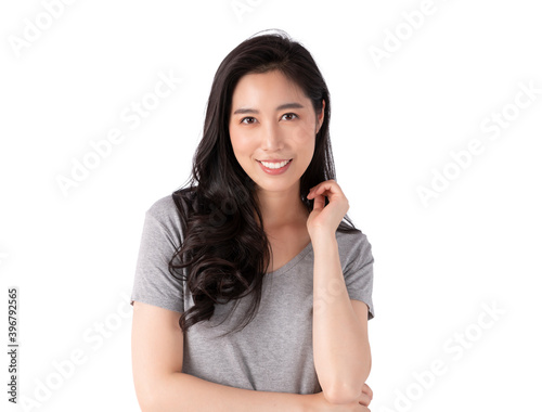 Portrait of a smiling Asian business woman looking at camera isolated over white background. Happy Young Asian Woman with blank copy space. Beauty emotion facial expression.