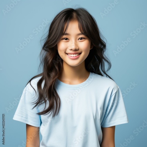 Portrait of a smiling Asian little girl with black hair on a blue background. Happy small Asian kid with a smile and long wavy hair. Cheerful white female child in a blue shirt with shiny white teeth.
