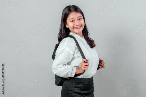 Portrait of a smiling Asian teenage girl in a white shirt and black skirt carrying a backpack, posing confidently on her first day back to school.