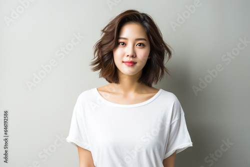 Portrait of a smiling Asian woman wearing a t-shirt with standing and looking at the camera. Face of healthy woman, Lifestyle portrait photography.