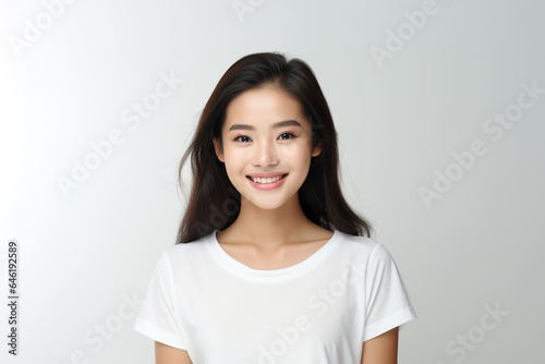 Portrait of a smiling Asian woman wearing a t-shirt with standing and looking at the camera. Face of healthy woman, Lifestyle portrait photography.