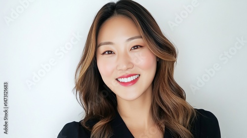 Portrait of a Smiling Asian Woman with Perfect Teeth, Radiant Complexion and Brown Wavy Hair against a Clean White Background