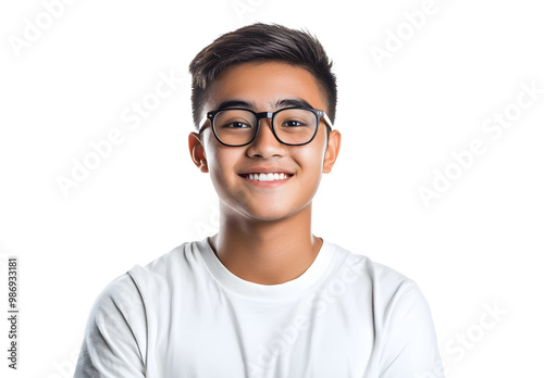 Portrait of a smiling, beautiful young Laos-american man wearing glasses and looking at the camera