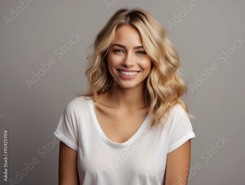 Portrait of a smiling blonde woman with wavy hair wearing a white t-shirt